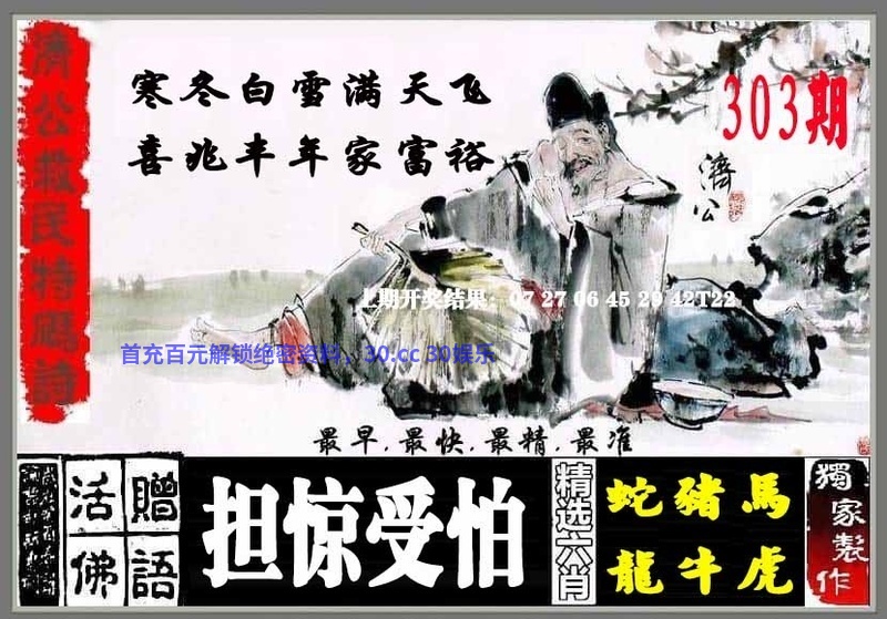 | 305期:济公特码诗 曾经沧海难为水,春光美好猪蛇牛。 解:猪蛇牛虎兔龙。 活佛赠语:【稀里哗啦】 解:鼠猪 七肖:猪蛇牛虎兔龙鼠 |